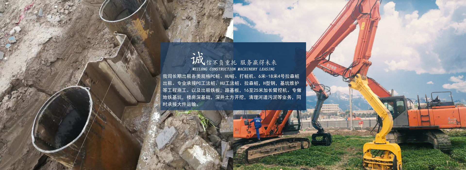 杭州偉龍機械成立于2009年,是一家專注拉森鋼板樁工程施工多年經驗的企業,專做地鐵基坑,樓房深基礎,深井土方開挖,清理河道污泥等業務,同時承接大件運輸。